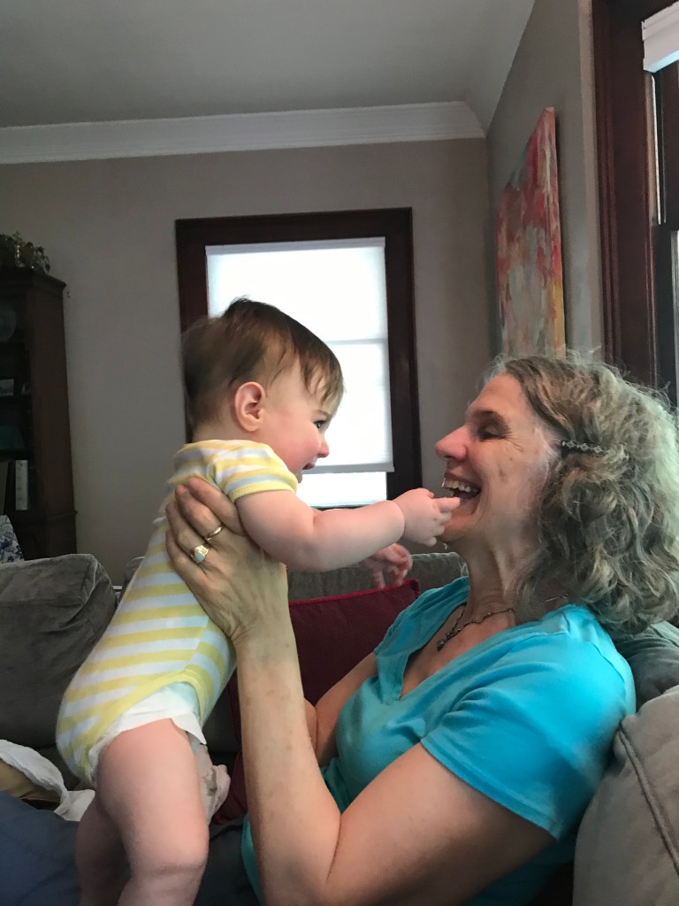 I have received a huge gift during this painful time in our country. I fervently asked for and was granted permission to go visit my daughter and her family in Lakewood, which is about a 45-minute drive from Kendal. I said that on my return, I would self-quarantine in my room for two weeks, and I shall. That part will be way less fun than what I am experiencing right now at my grandson’s home. He turned six months old on Tuesday and I arrived here Saturday evening, just before his bedtime. But my stay here has been worth any small sacrifice when I go back to my own home.